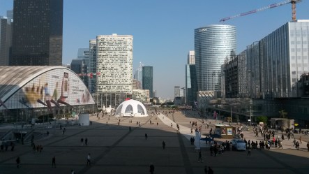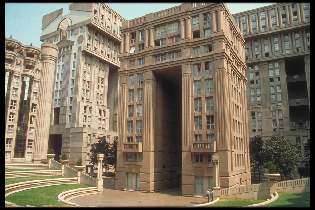 Ville nouvelle de Marne-la-Vallée : Les Espaces d’Abraxas (vue de l’Arche) de Ricardo Bofill ; lequel, dans une interview au Journal Le Monde du 8 février 2014, avouait « Je n’ai pas réussi à changer la ville » (Photo Marcus/ Flickr) :